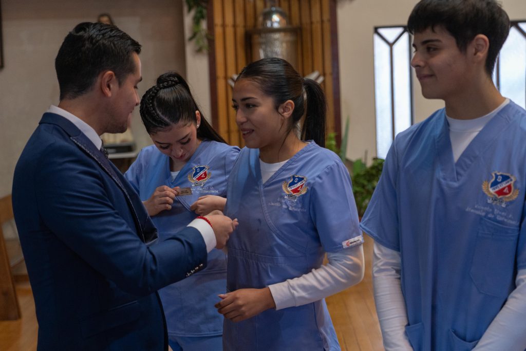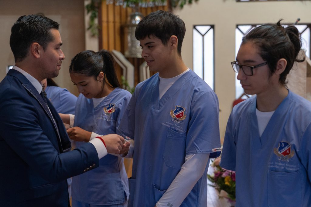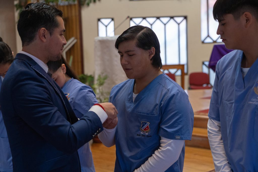Durante la ceremonia, las estudiantes de 4° medio E, acompañados por sus compañeras de 3° medio E, vivieron un momento especial al recibir las piochas bendecidas de manos de su profesor jefe. Este gesto simboliza el inicio de sus prácticas duales, constituyendo un paso clave en su proceso formativo.