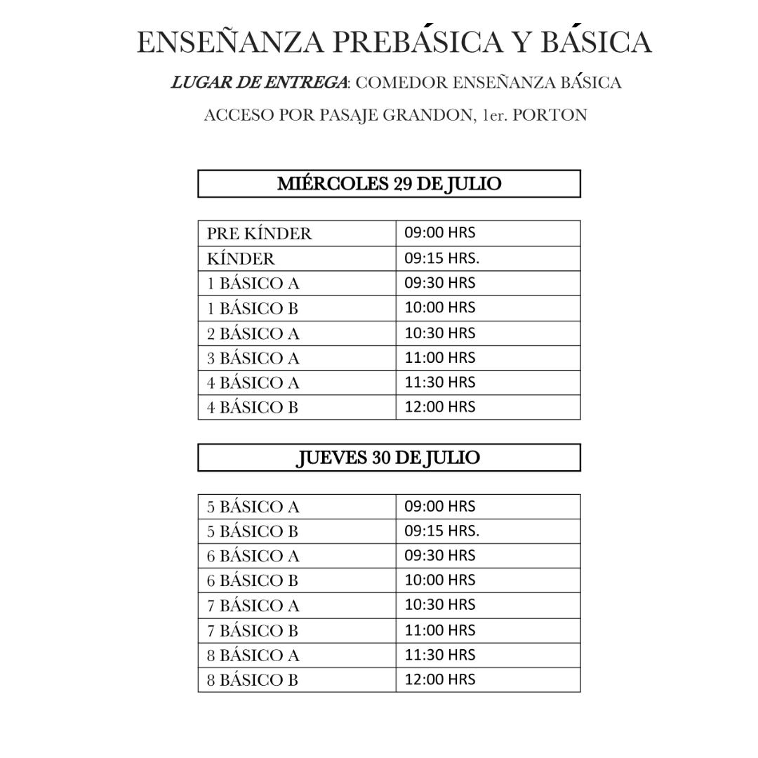 A continuación, entregamos ustedes el único horario para realizar el retiro de las canastas entregadas por JUNAEB según el curso de cada alumno.