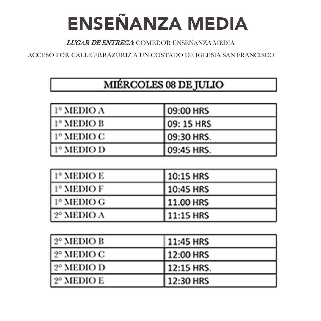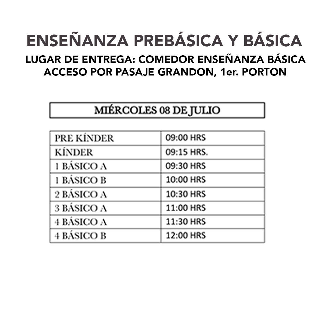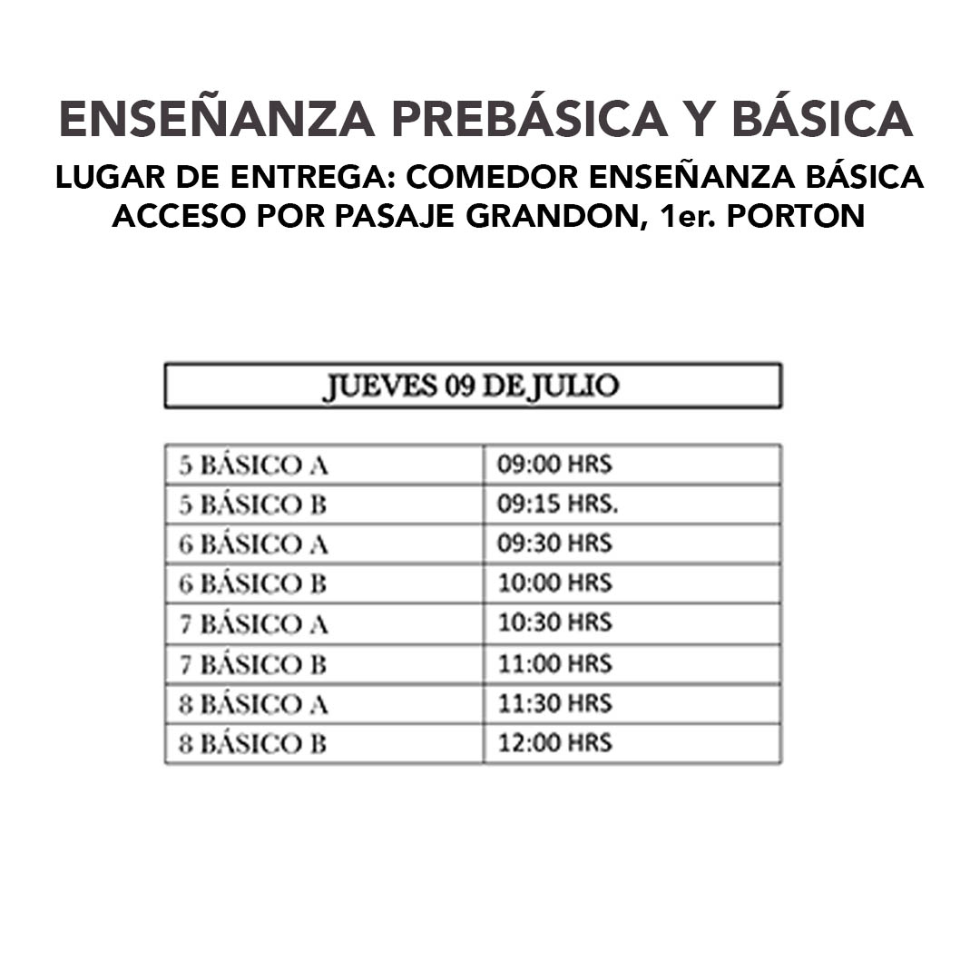 A continuación, entregamos ustedes el único horario para realizar el retiro de las canastas entregadas por JUNAEB según el curso de cada alumno. Se ruega respetar los horarios.