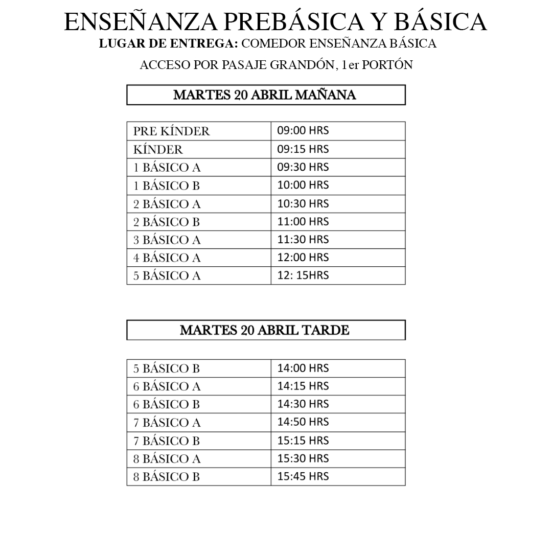 A continuación, entregamos ustedes el único horario para realizar el retiro de las canastas entregadas por JUNAEB según el curso de cada alumno. Se ruega respetar los horarios.