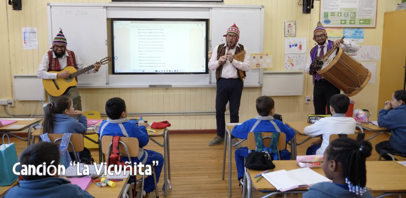 En el desarrollo de las clases de Lengua y Cultura de los Pueblos Originarios y el rescate del conocimiento de los Pueblos Originarios, se realizó intervención educativa en el 2°año básico a través de la música e instrumentos andinos. Para ello nos acompañaron los docentes Claudio Segura y Patricio Peralta quienes interpretaron la canción “La vicuñita” y permitieron el reconocimiento de instrumentos andinos.