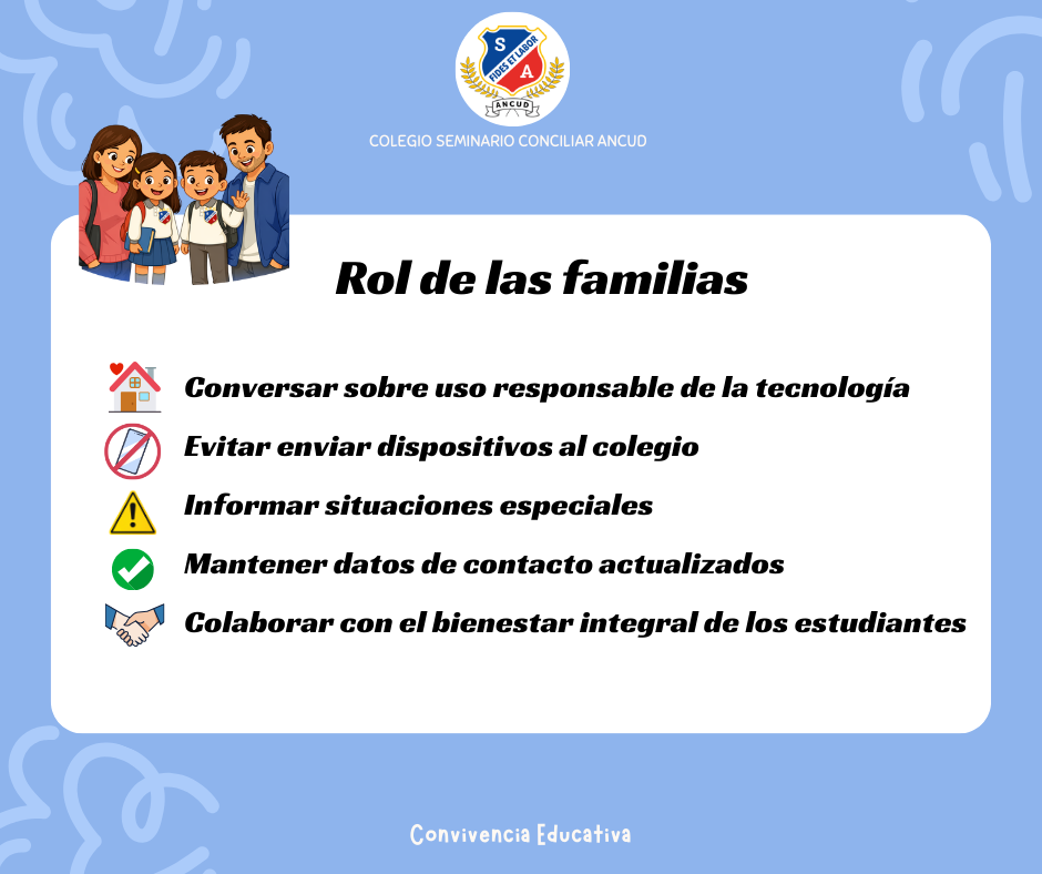 Compartimos con ustedes información importante sobre el uso de celulares y dispositivos móviles durante el presente año académico 2026. Esta medida se enmarca en lo establecido en el Anexo 14 y en las orientaciones del Ministerio de Educación, las cuales buscan restringir el uso de celulares en los establecimientos educacionales con el fin de mejorar la convivencia escolar y la concentración de los estudiantes.
