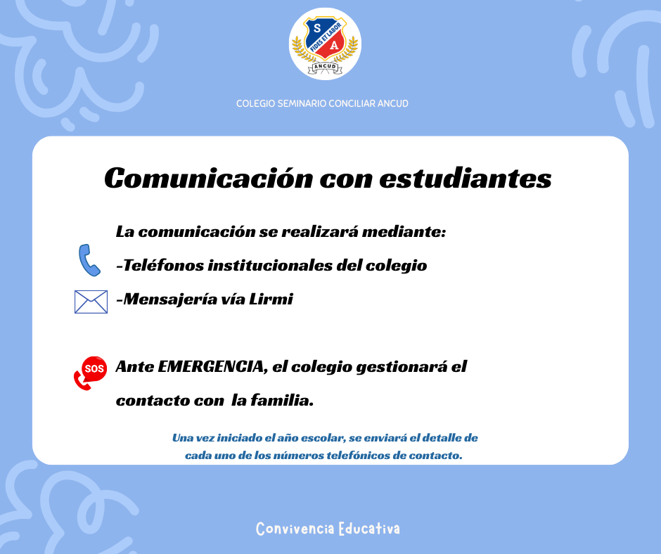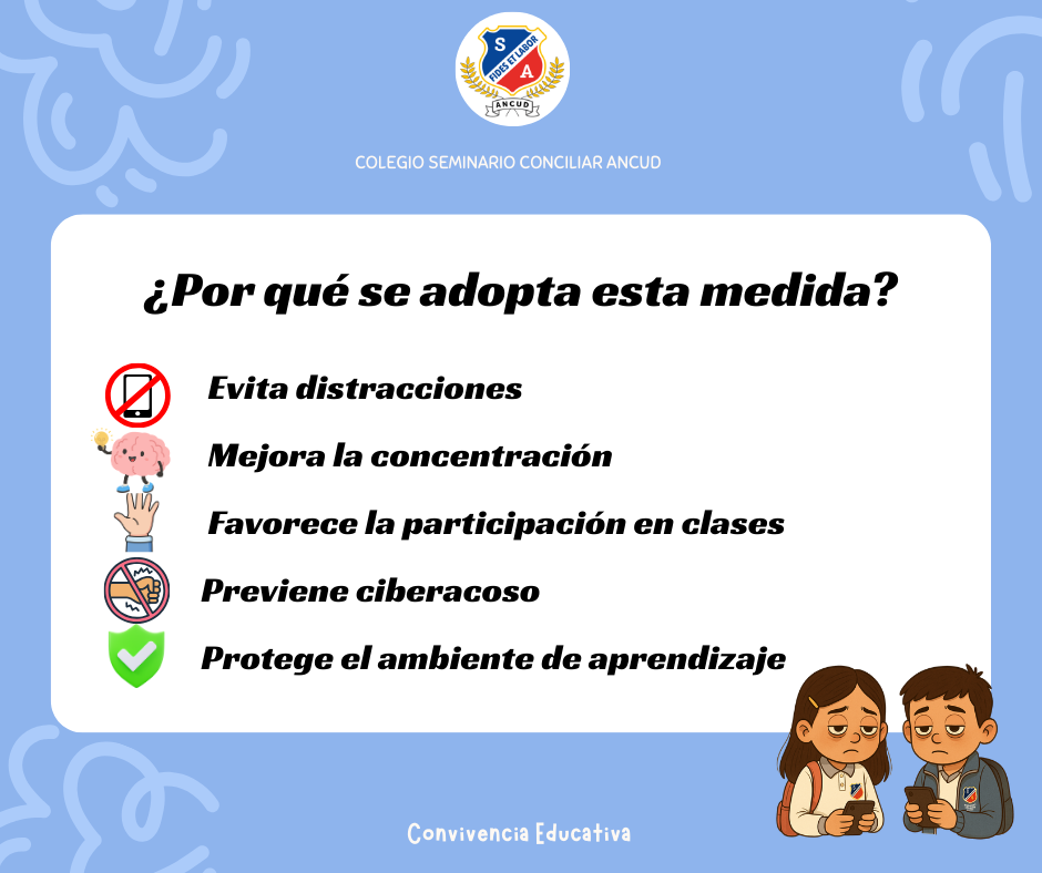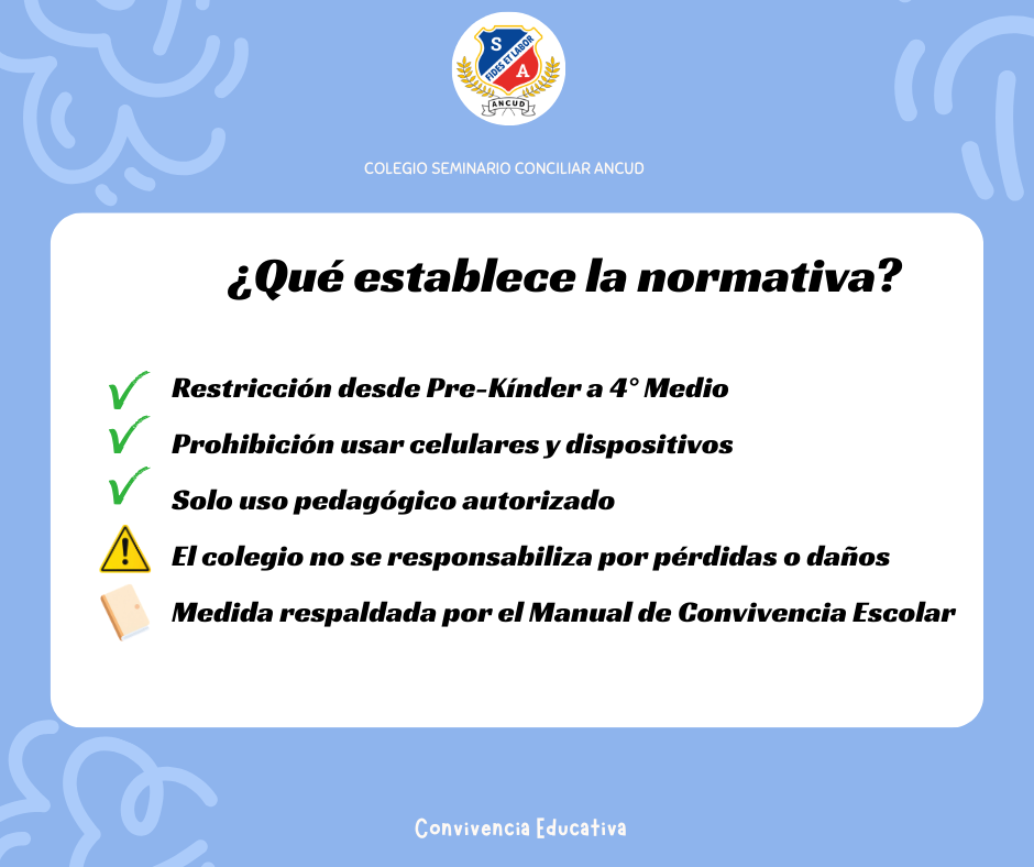 Compartimos con ustedes información importante sobre el uso de celulares y dispositivos móviles durante el presente año académico 2026. Esta medida se enmarca en lo establecido en el Anexo 14 y en las orientaciones del Ministerio de Educación, las cuales buscan restringir el uso de celulares en los establecimientos educacionales con el fin de mejorar la convivencia escolar y la concentración de los estudiantes.